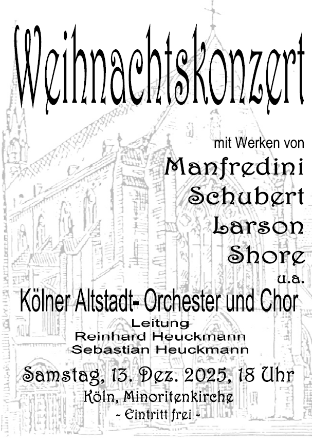 Konzerte Die nächsten Konzerte: 13. Dezember 2025, 18 Uhr, Minoritenkirche Köln 14. Dezember 2025, 15 Uhr, Ev. Gemeindezentrum, Köln-Bocklemünd